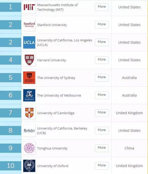 前4個都是美國的,第5第6都是澳洲的,第7是英國劍橋,第10是英國牛津! 看看澳洲高校在這次排名中整體的表現